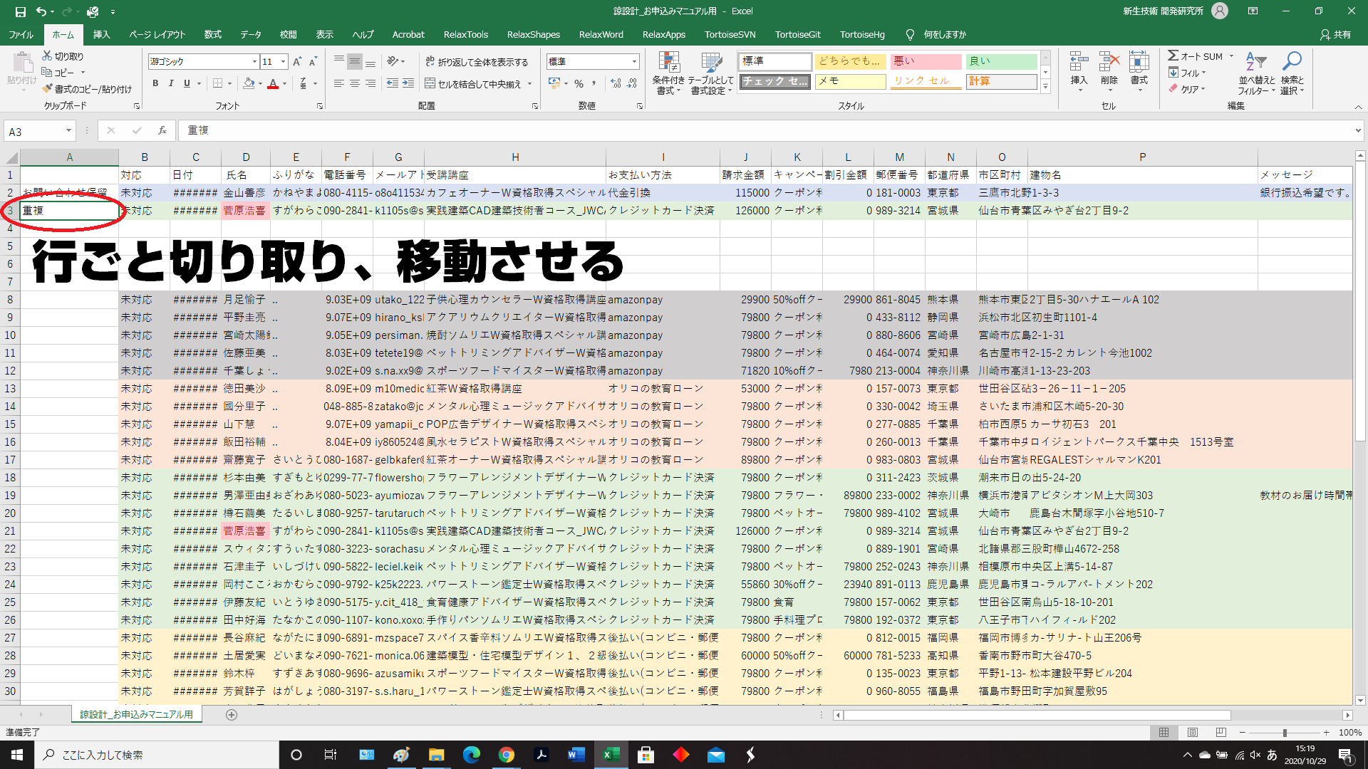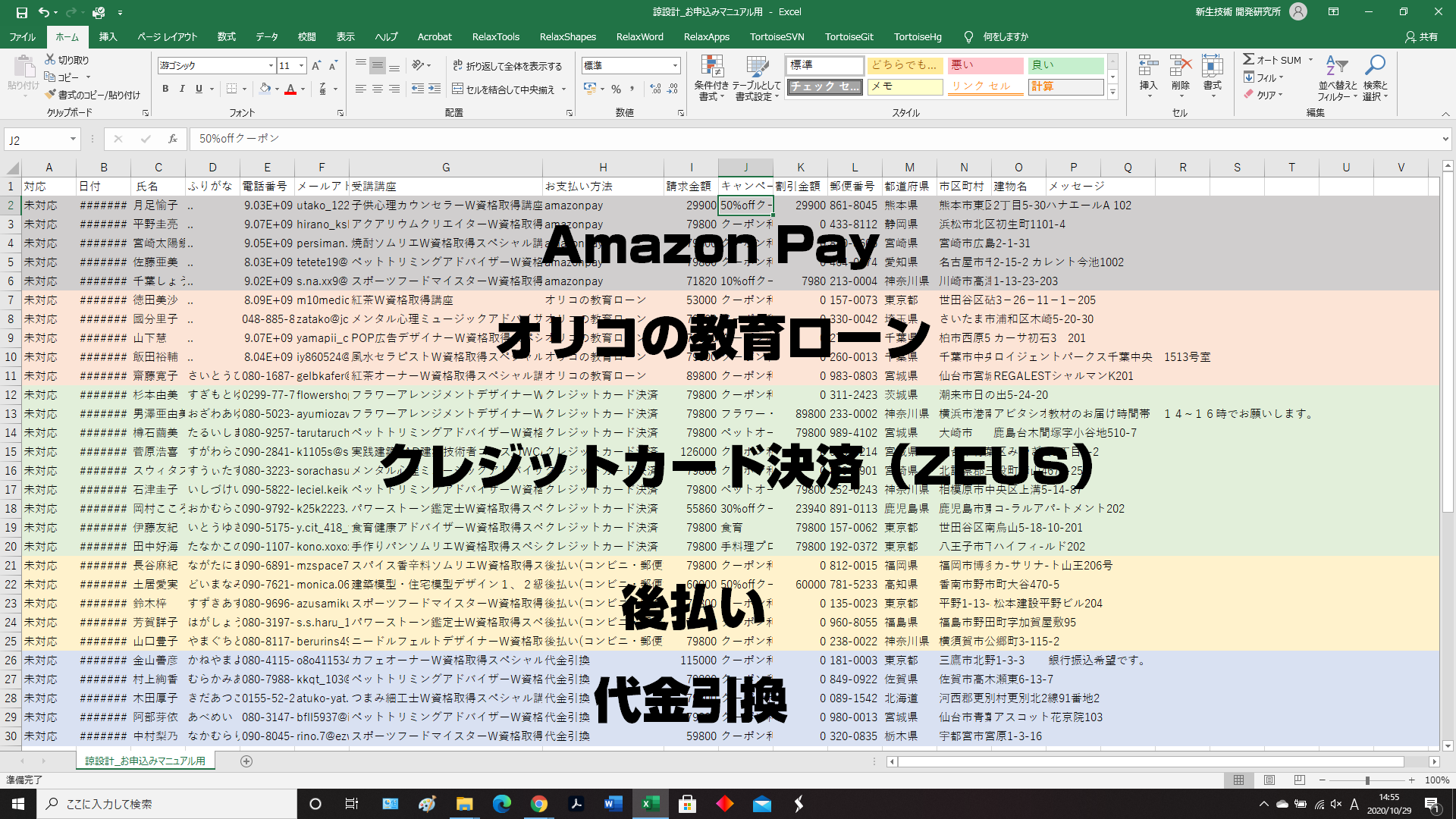 - 届いているデータ全てメールアドレス検索を行う必要があるが、後払いのチェックが終わったら、先に後払いのデータをテンプレート「佐川送り状取り込み(支払方法・メルアド・備考列あり)」にまとめる