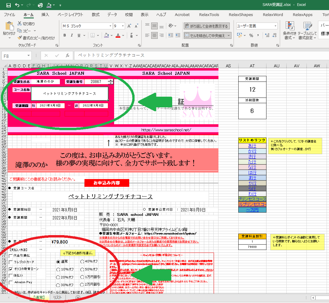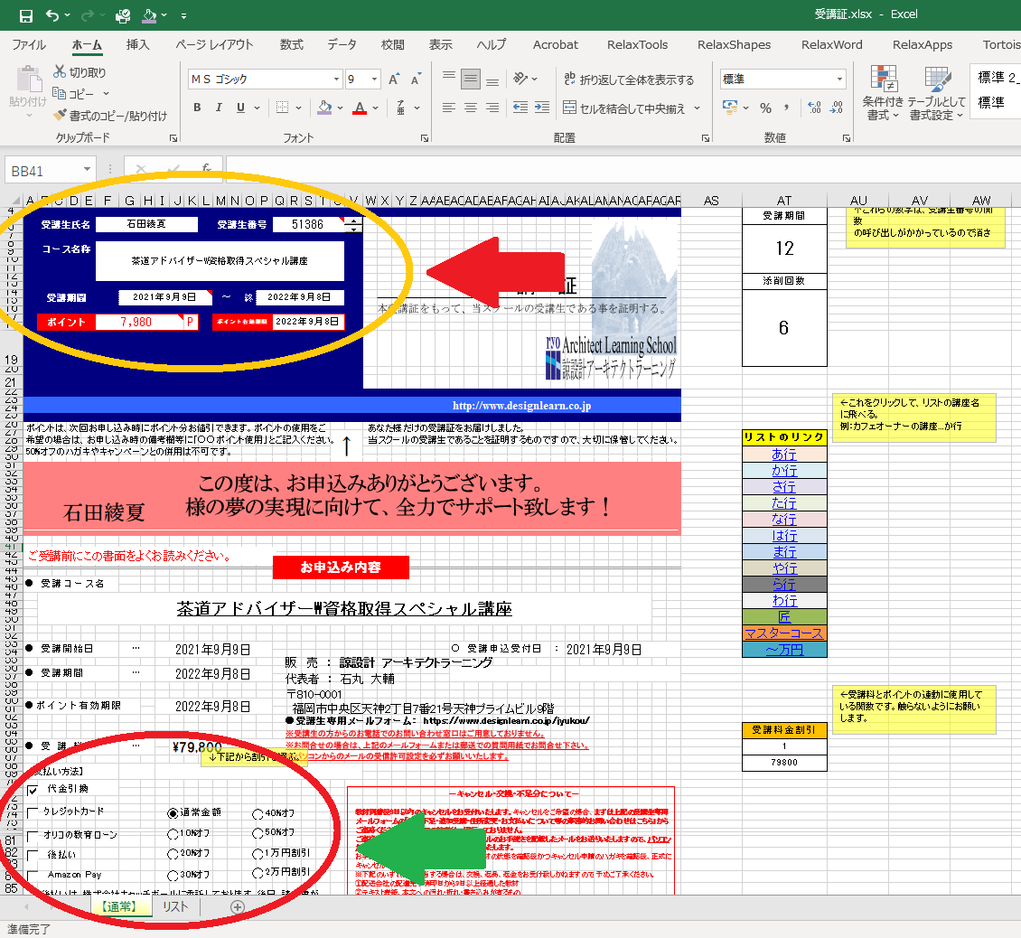 - お客様のお名前をコピーし、受講証の「受講生氏名」に貼り付ける